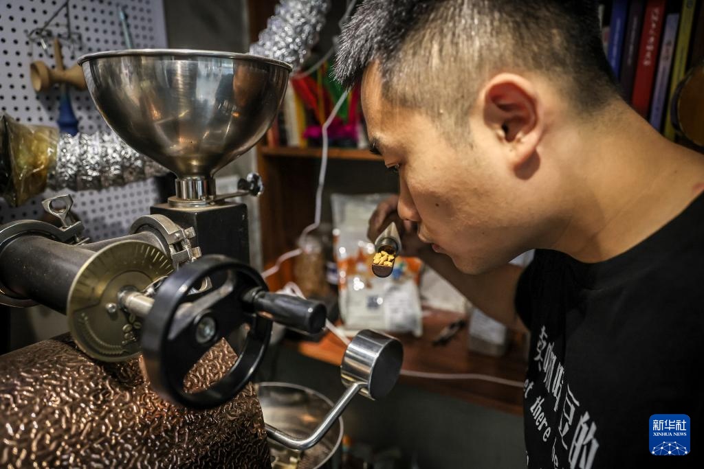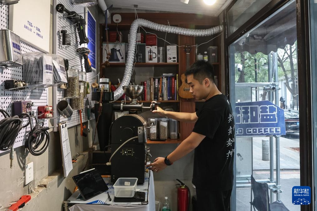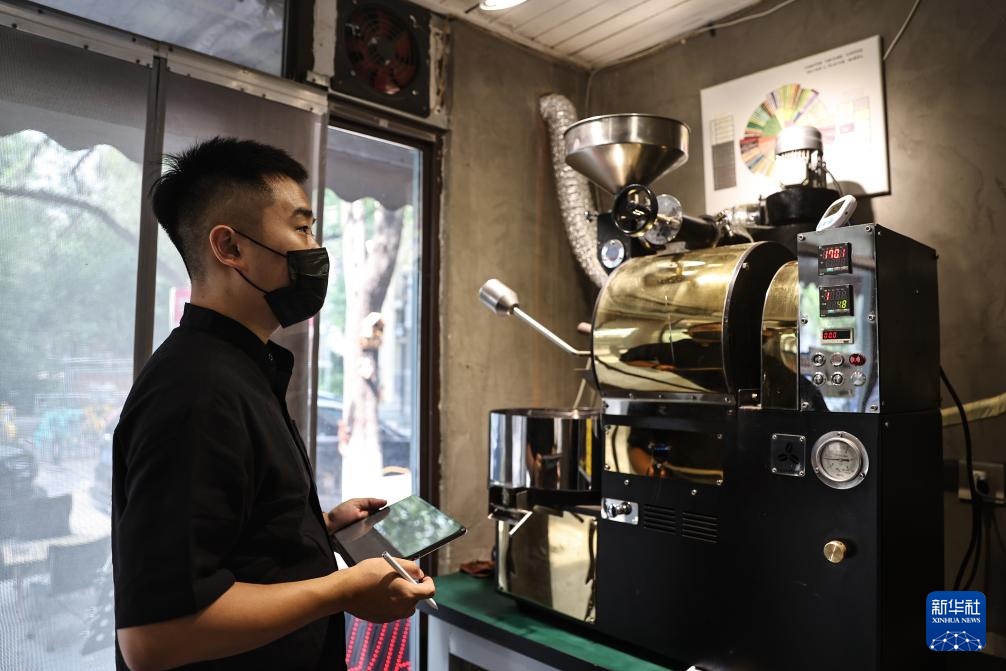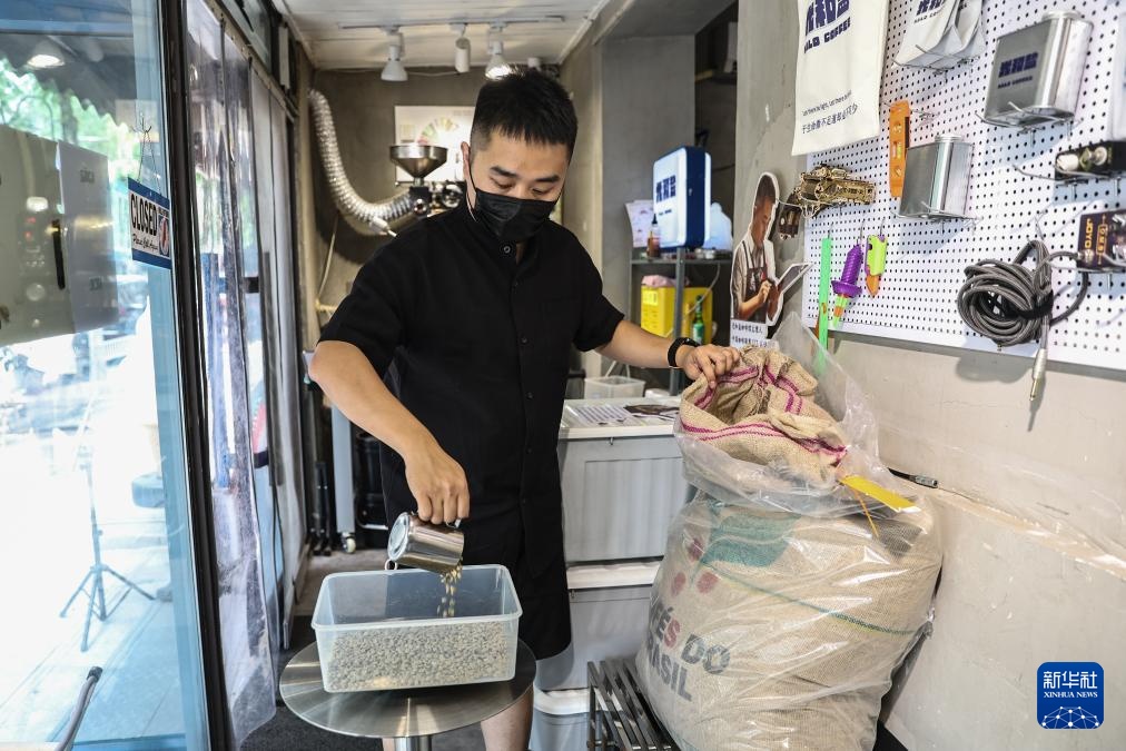 6月18日,刘佳迪在店里烘焙咖啡豆。新华社记者 潘昱龙 摄