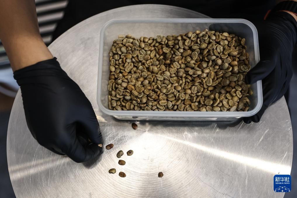 6月18日,刘佳迪在烘焙前把有缺陷的咖啡生豆挑捡出来。新华社记者 潘昱龙 摄