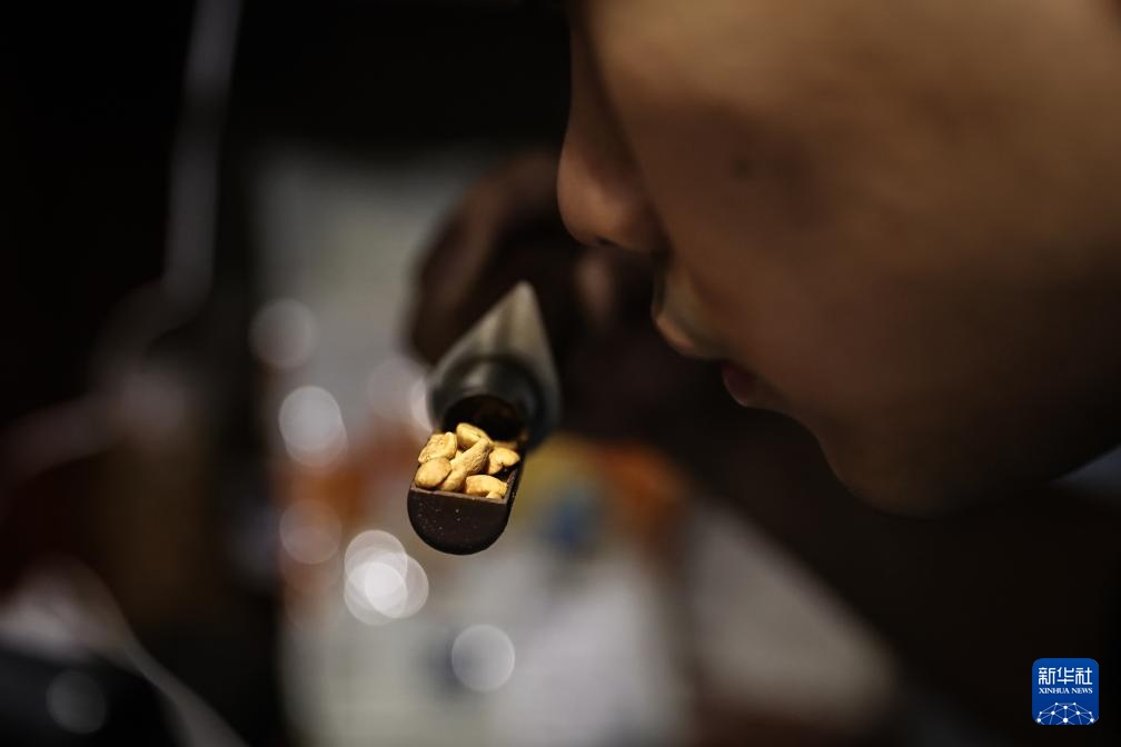 6月18日,刘佳迪通过咖啡豆散发出的气味,判断烘焙情况。新华社记者 潘昱龙 摄