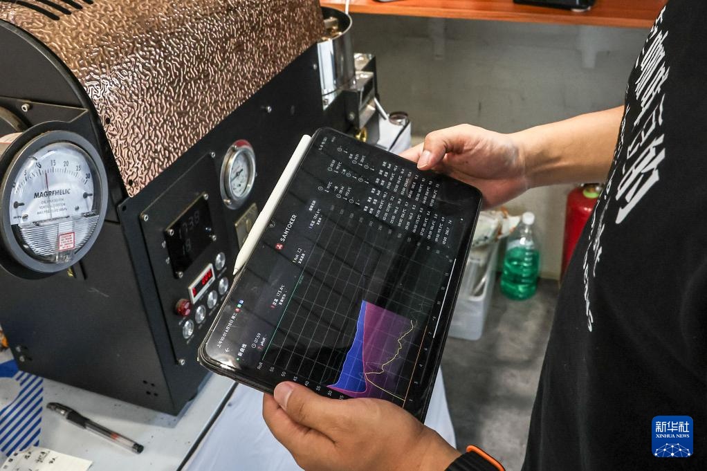 6月18日,烘焙咖啡豆的过程中,刘佳迪记录烘焙信息。新华社记者 潘昱龙 摄