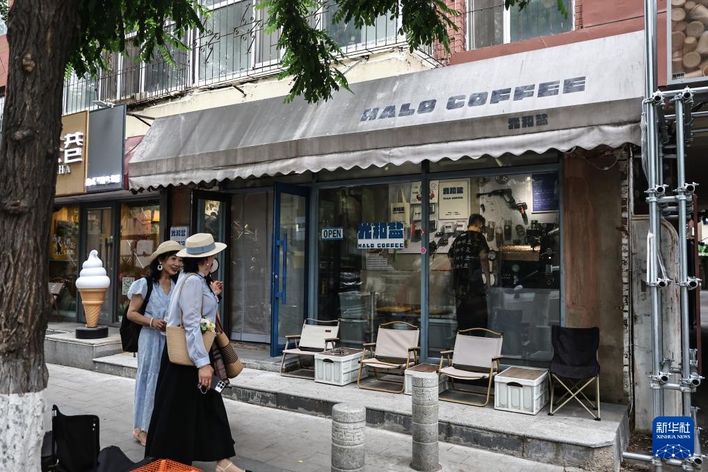 6月18日,在沈阳“咖啡小巷”,游客从刘佳迪的店铺前经过。新华社记者 潘昱龙 摄