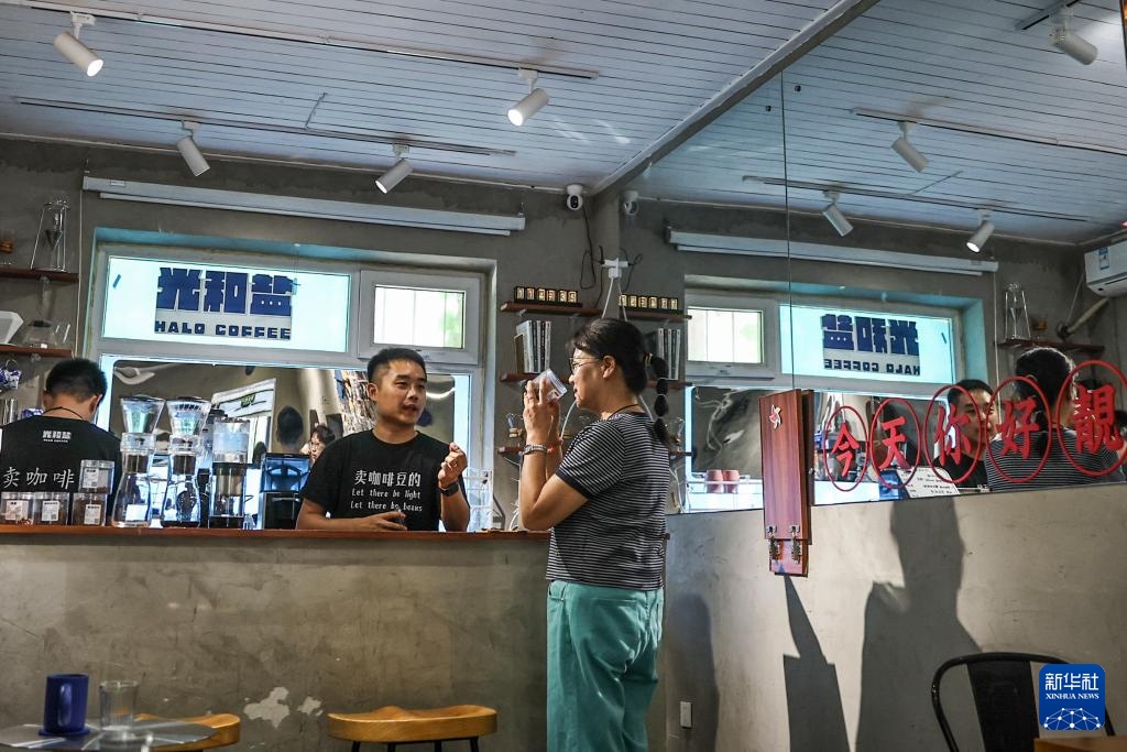 6月18日,刘佳迪在店里为顾客介绍咖啡的风味。新华社记者 潘昱龙 摄