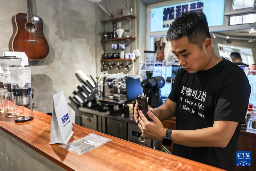 6月18日,刘佳迪给按顾客需求烘焙好的咖啡豆拍照,准备发货。新华社记者 潘昱龙 摄