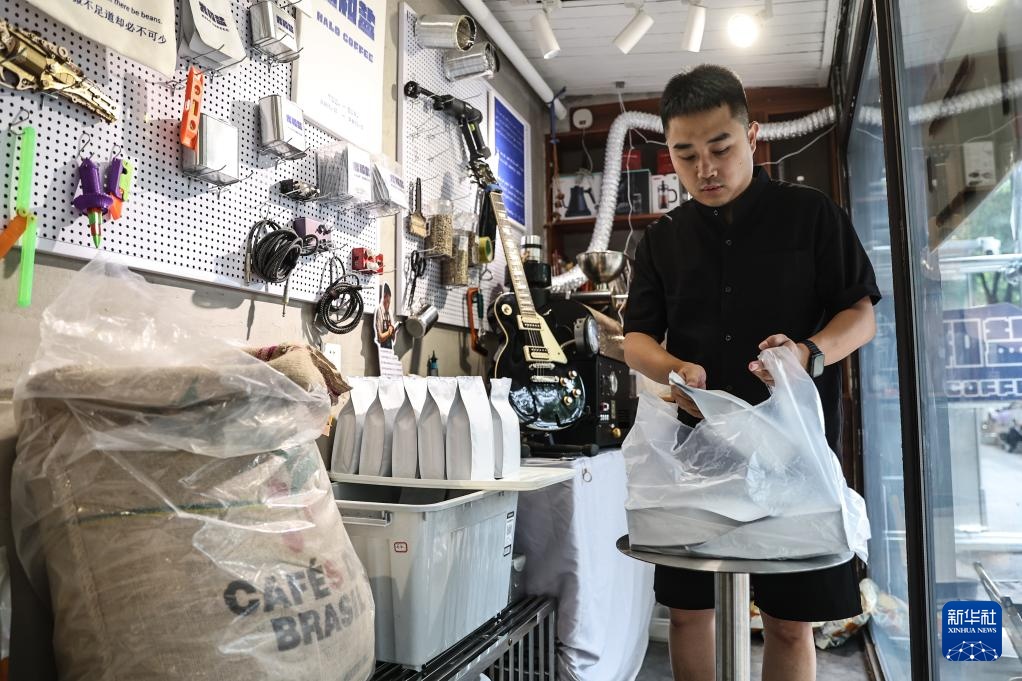 6月26日,刘佳迪把包装好的熟咖啡豆装袋,准备通过快递发给客户。新华社记者 潘昱龙 摄