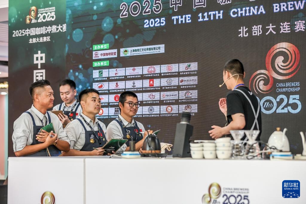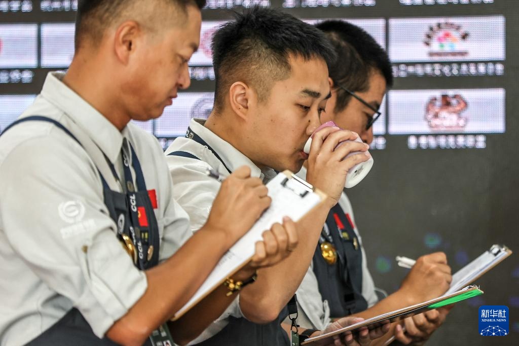 6月28日,刘佳迪(中)在大连举办的一场咖啡冲煮比赛中作为评委品尝参赛选手冲煮的咖啡。新华社记者 潘昱龙 摄