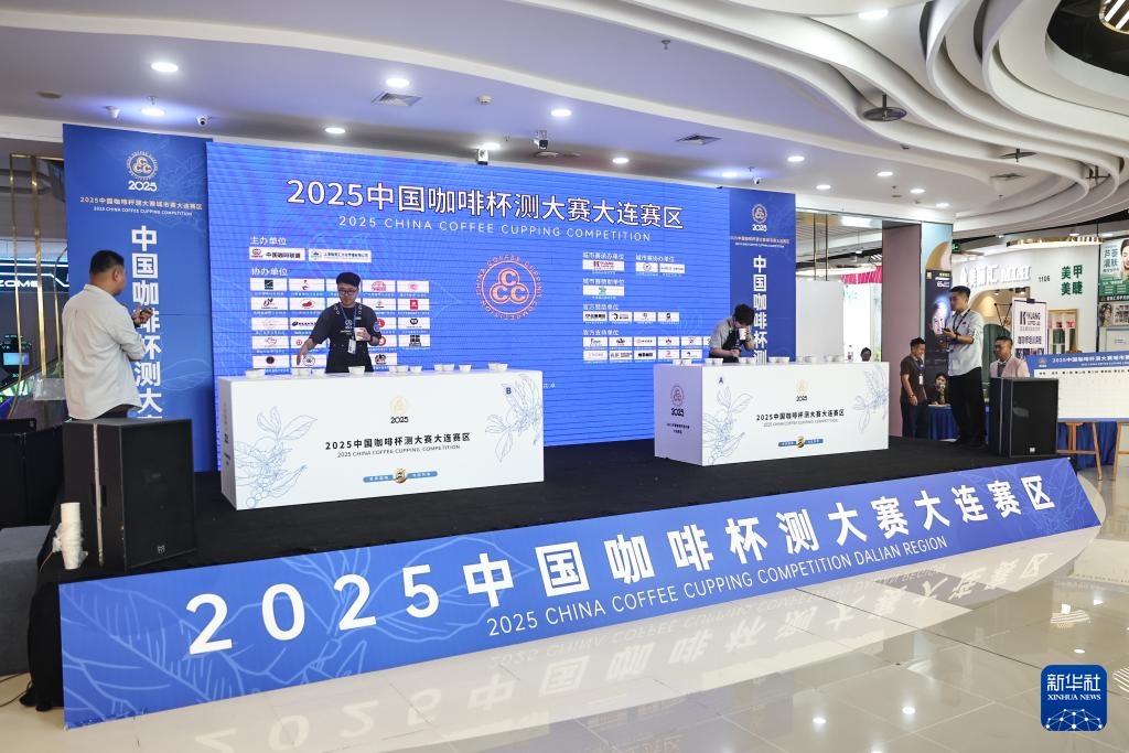 6月29日,刘佳迪(台上右一)在大连举办的一场咖啡杯测比赛中担任技术评审。新华社记者 潘昱龙 摄