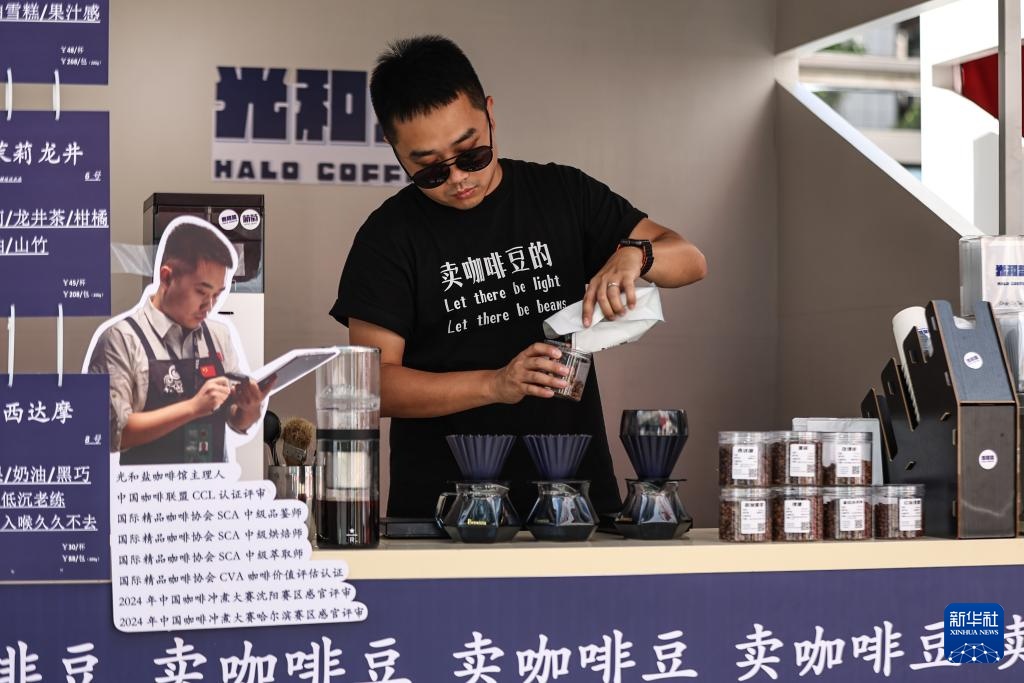 6月21日,在沈阳举行的咖啡市集上,刘佳迪整理售卖的咖啡豆。新华社记者 潘昱龙 摄