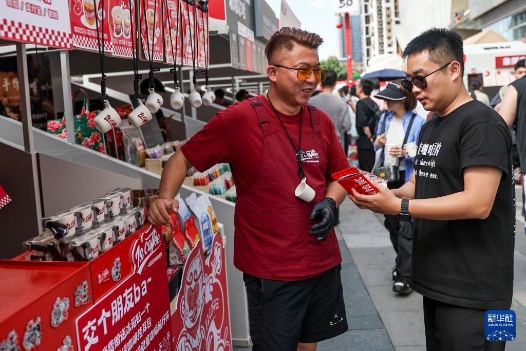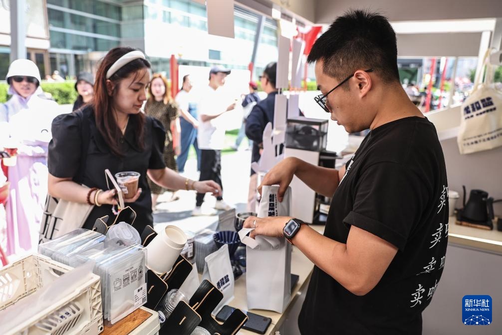 6月21日,在沈阳举行的咖啡市集上,刘佳迪(右)把顾客选购的咖啡豆装袋。新华社记者 潘昱龙 摄