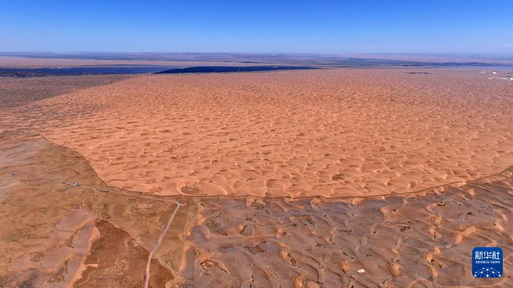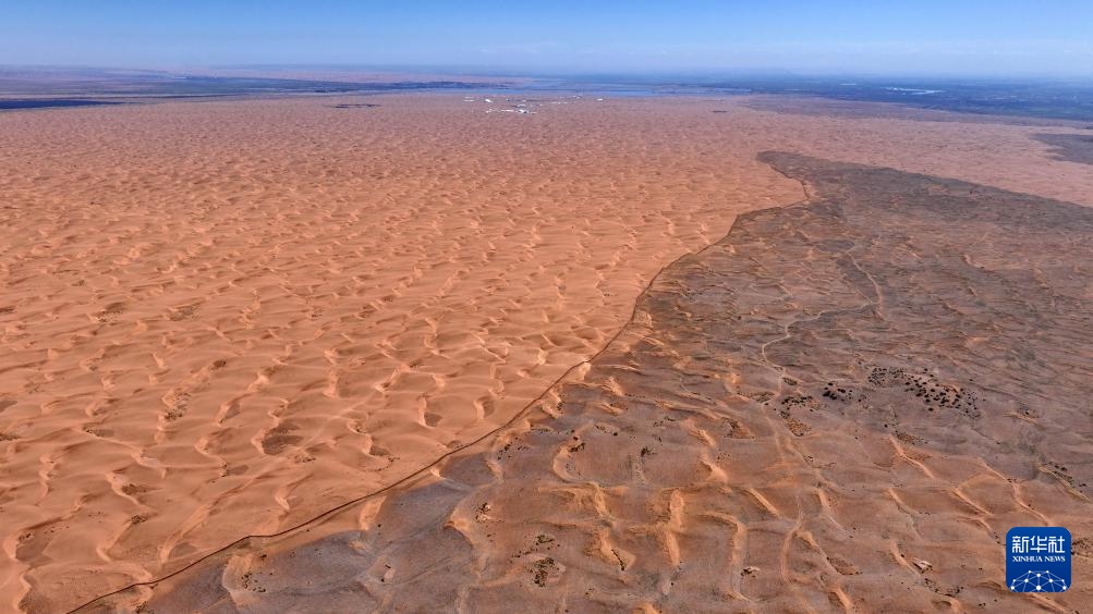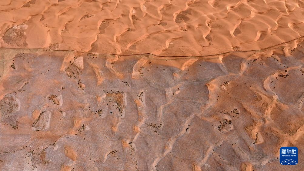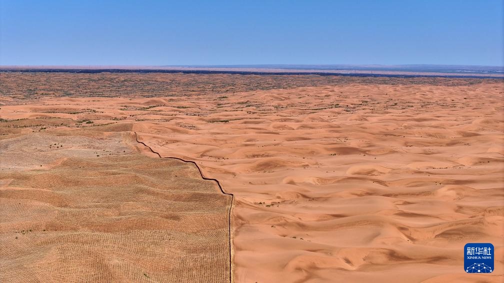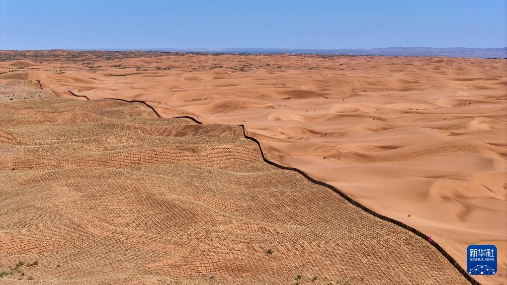 这是6月30日在宁夏中卫市长流水村拍摄的腾格里沙漠东南缘治沙锁边工程现场(无人机照片)。新华社记者 王鹏 摄