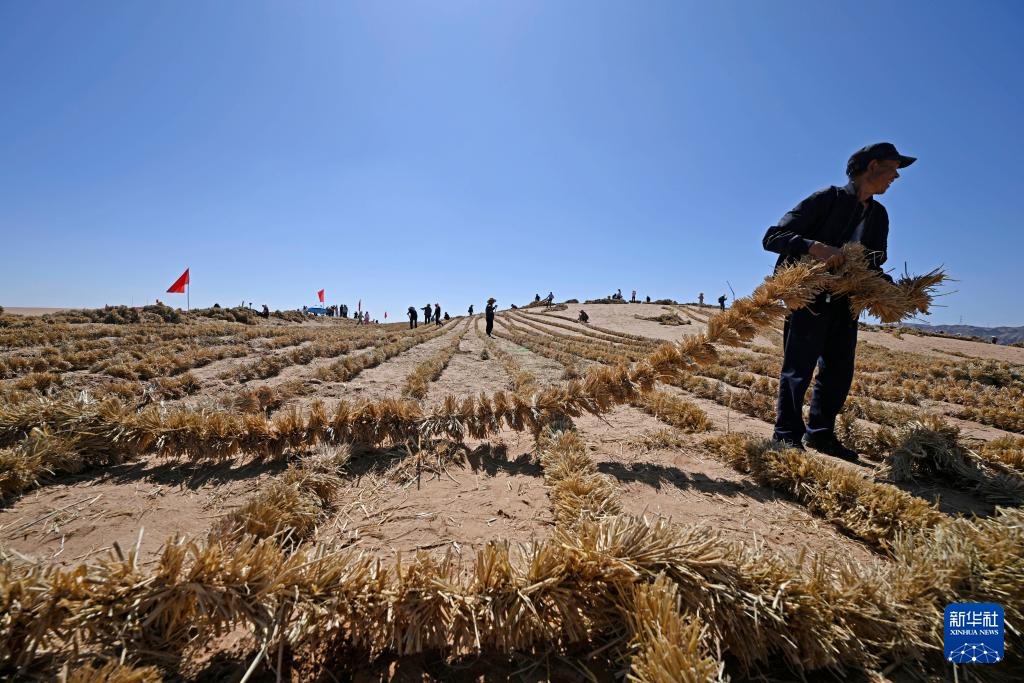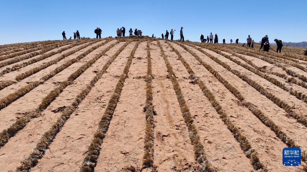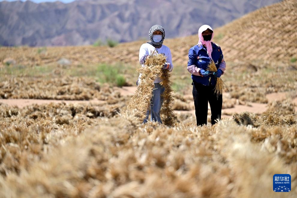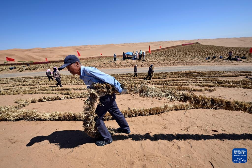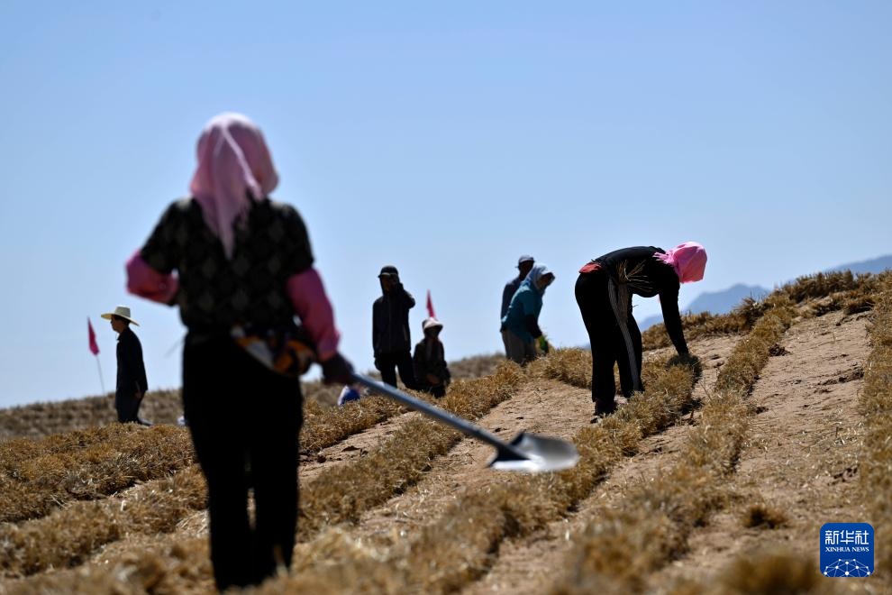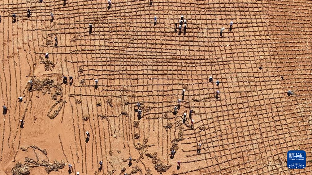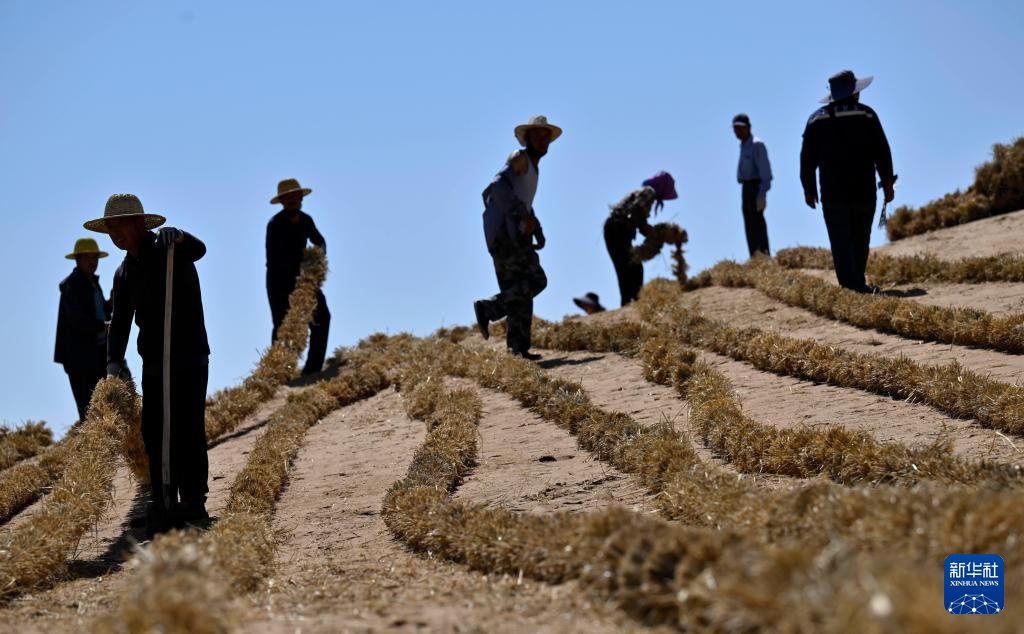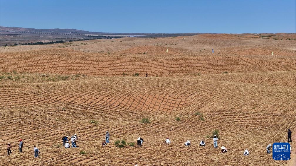 6月30日,治沙工人在位于宁夏中卫市长流水村的腾格里沙漠东南缘扎草方格。新华社记者 王鹏 摄