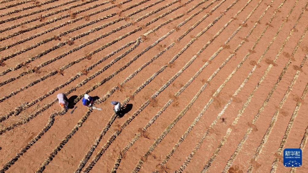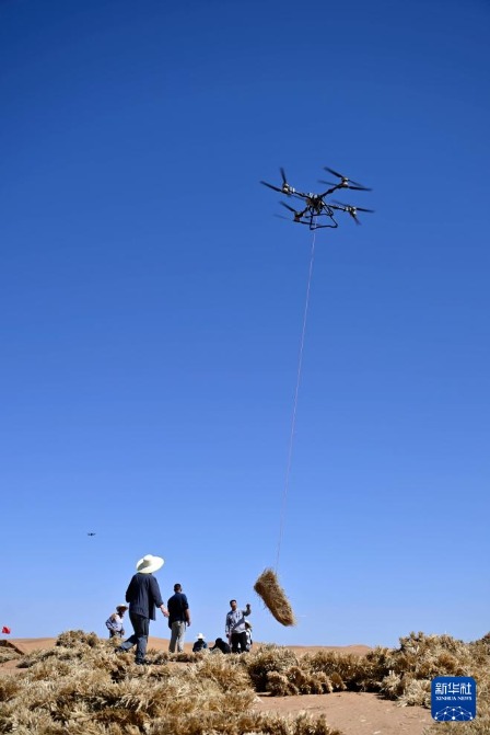 6月30日,治沙工人在位于宁夏中卫市长流水村的腾格里沙漠东南缘利用无人机吊运草料。新华社记者 王鹏 摄