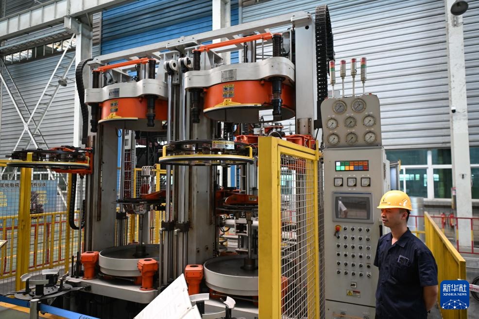 位于揭阳的巨轮智能装备股份有限公司的液压式轮胎硫化机(6月29日摄)。新华社记者 邓华 摄