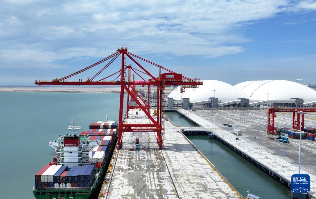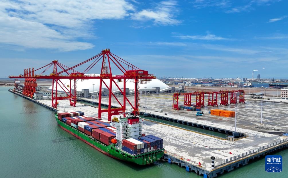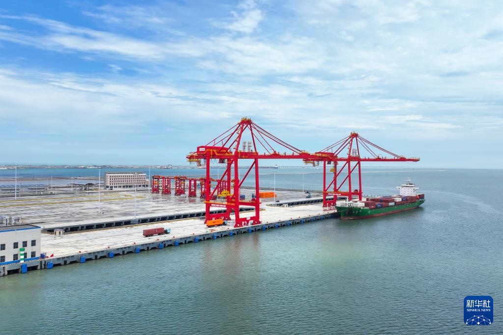 7月2日,集装箱船舶靠泊在东营港一突堤集装箱码头(无人机照片)。新华社记者 朱峥 摄