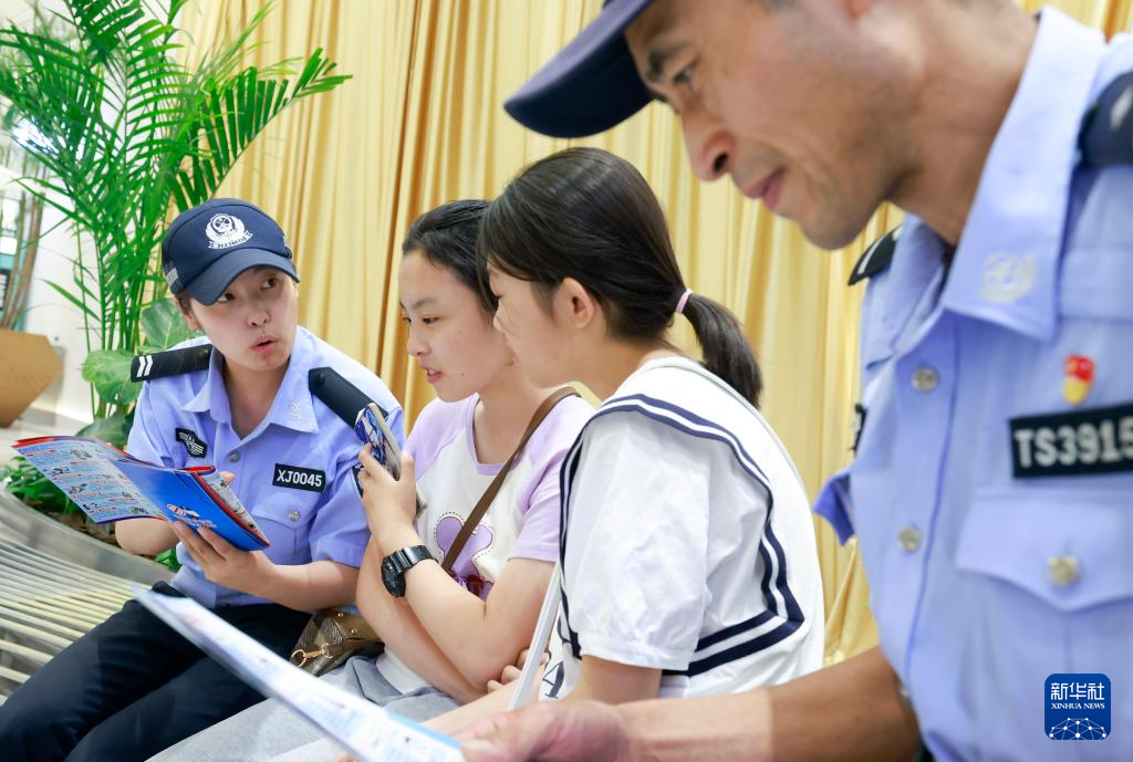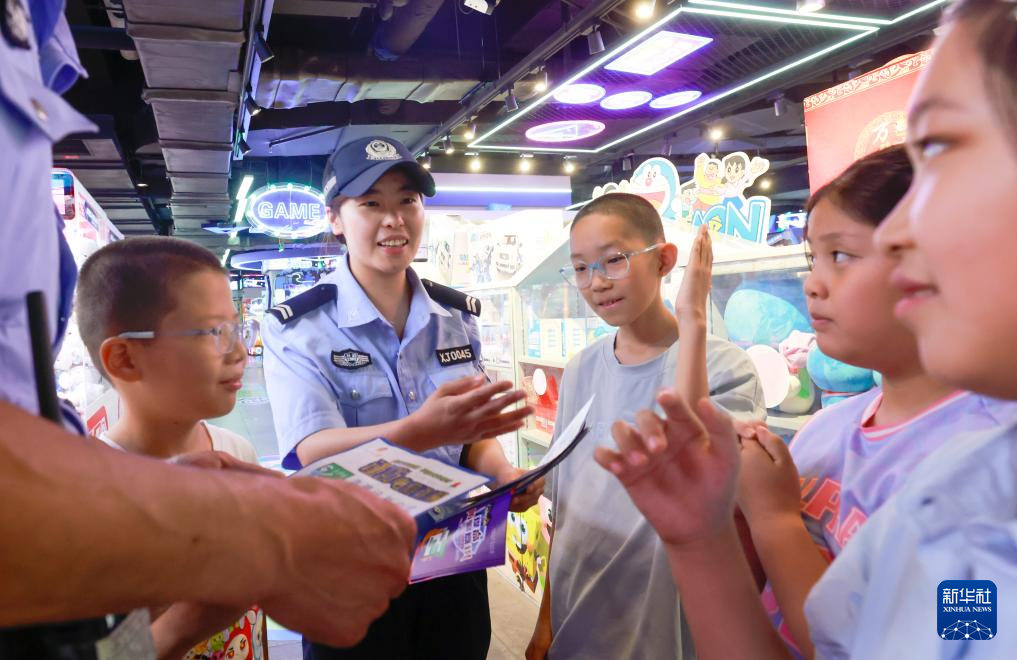 7月2日,在乌鲁木齐时代广场内,乌鲁木齐市公安局天山区分局新民路派出所辅警苏俊霞向小朋友宣传防溺水、反诈等安全知识。新华社记者 王菲 摄