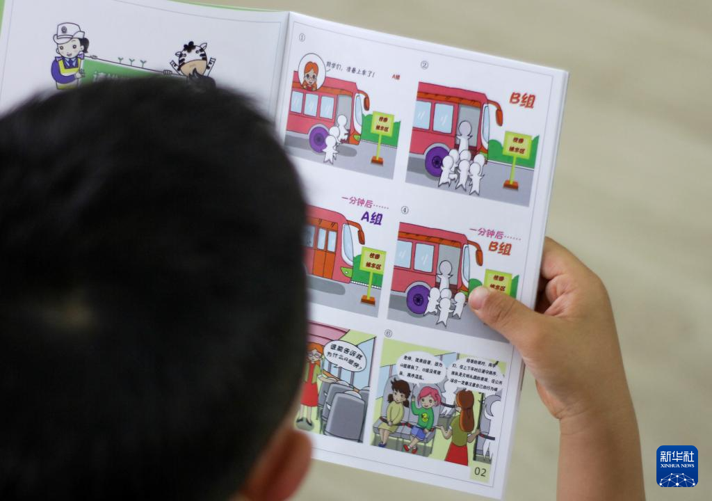 7月3日,在乌鲁木齐一所幼儿园,小朋友在阅读交通安全绘本。新华社记者 王菲 摄