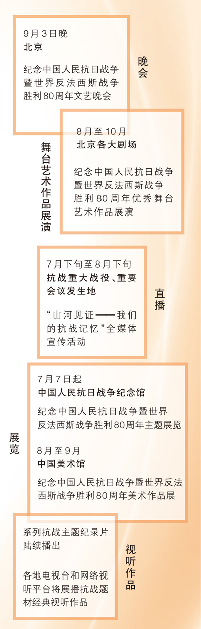 同时,全国各地电视台和网络视听平台还将展播一大批抗战题材经典视听作品。“重温经典”频道将在7月晚间档播出《悬崖》《记忆的证明》等剧目;在8月播出《闯关东》《八路军》《彭德怀元帅》;在9月的下午档播出《太行山上》,晚间档播出《亮剑》《历史的天空》等。
