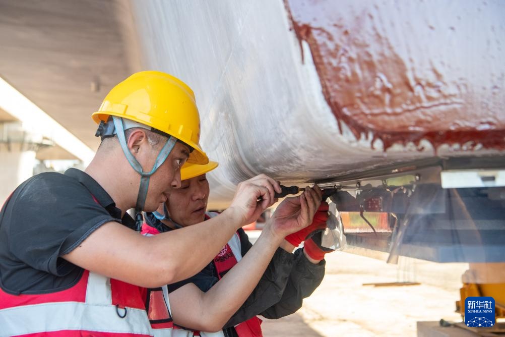7月5日,工人在渝万高铁江林村特大桥架梁施工现场作业。新华社记者 唐奕 摄