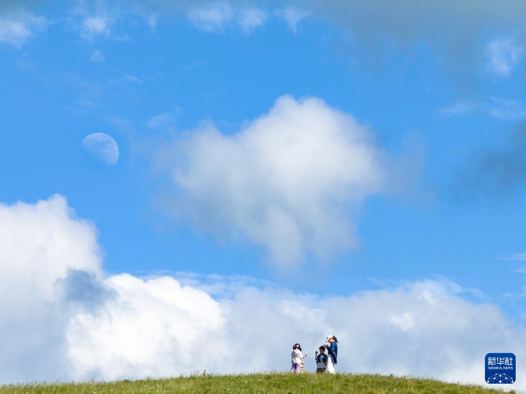 7月5日,游客在敕勒川高山草原游玩(无人机照片)。新华社记者 马金瑞 摄
