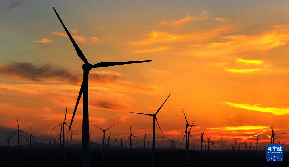 夕阳映照下的新疆哈密市三塘湖风电场一角(2024年9月10日摄,无人机照片)。这里是“疆电外送”的配套电源地之一。新华社记者 胡虎虎 摄