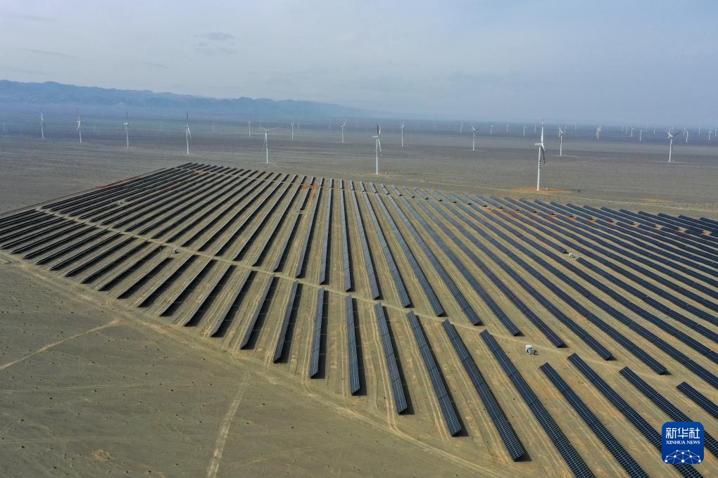 这是在新疆哈密市伊吾县拍摄的哈密—重庆±800千伏特高压直流输电工程配套新能源项目(2025年3月23日摄,无人机照片)。新华社记者 丁磊 摄