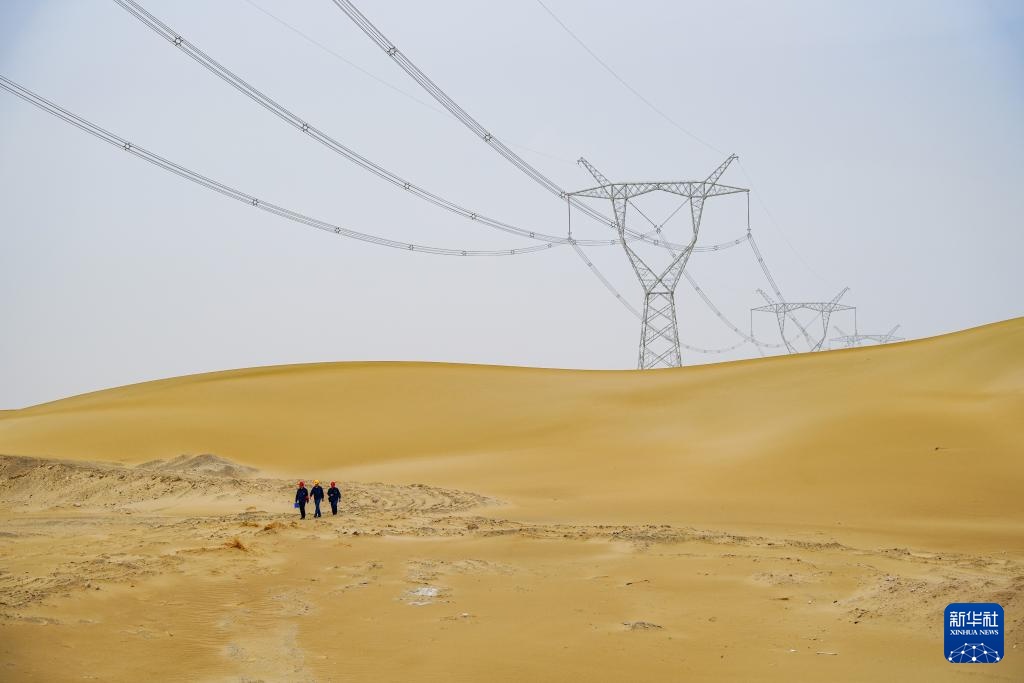 在新疆巴音郭楞蒙古自治州尉犁县,国网新疆电力员工巡视巴州—罗布泊—若羌750千伏输电线路(2025年4月27日摄)。该线路是新疆环塔里木盆地750千伏输变电环网工程的组成部分。新华社记者 徐宏岩 摄