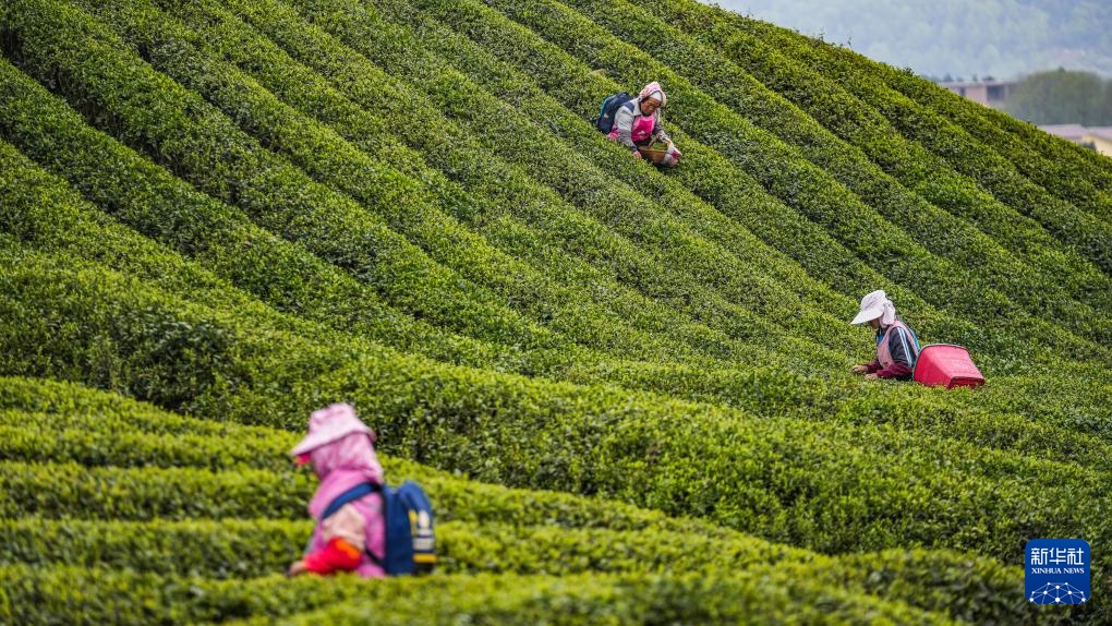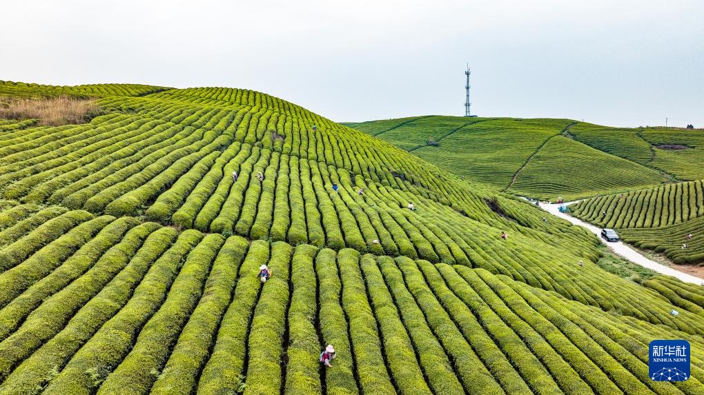茶农在贵州省安顺市西秀区双堡镇山京茶场采茶(2025年4月4日摄,无人机照片)。新华社记者 陶亮 摄