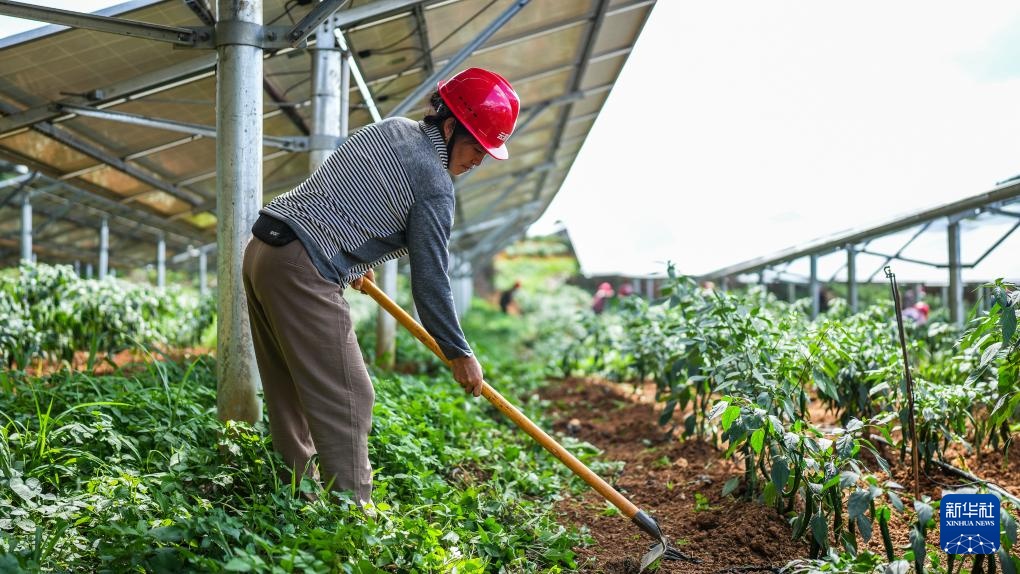 当地村民在贵州金元么站农业光伏电站光伏板间的土地上劳作(7月3日摄)。新华社记者 陶亮 摄