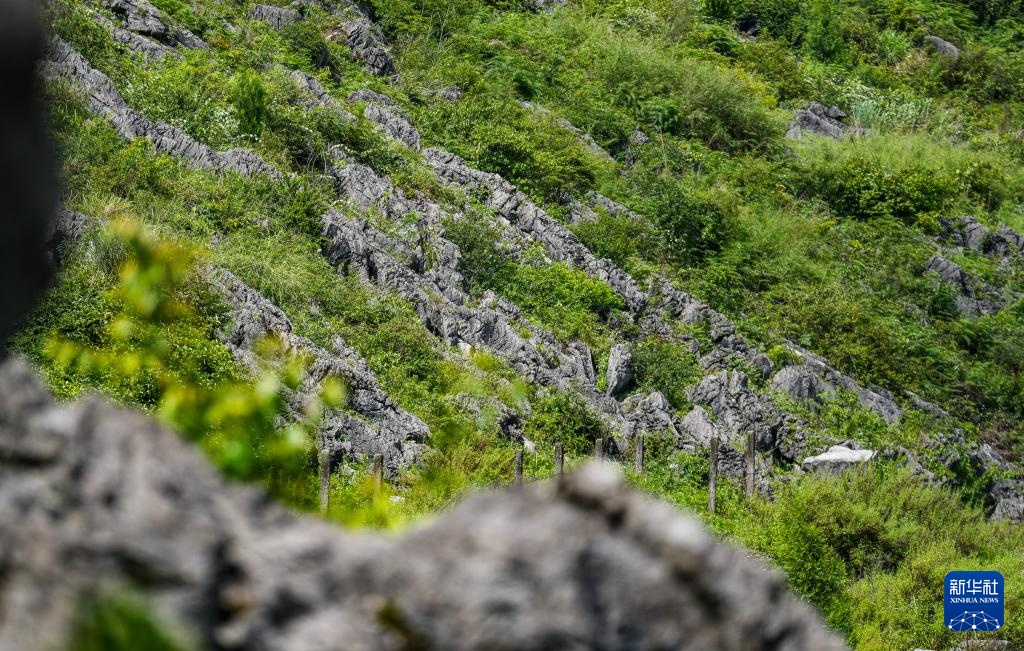 六盘水市乌蒙山东部石漠化综合治理和生物多样性保护项目六枝标段,针对岩石裸露率高、土层瘠薄、植被退化严重的情况,采取补植山桐子为主的生态修复措施(2025年6月28日摄)。新华社记者 陶亮 摄