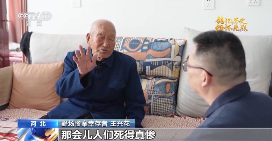 野场惨案幸存者 王兴花:那会儿人们死得真惨。日军头一次问,八路军东西在哪儿,都说不知道,第二次还问还是这一套,第三次日军说,说了你们就能活,要不说统统开枪灭掉你们,王璞站起来说不知道,大家伙一致说不知道。