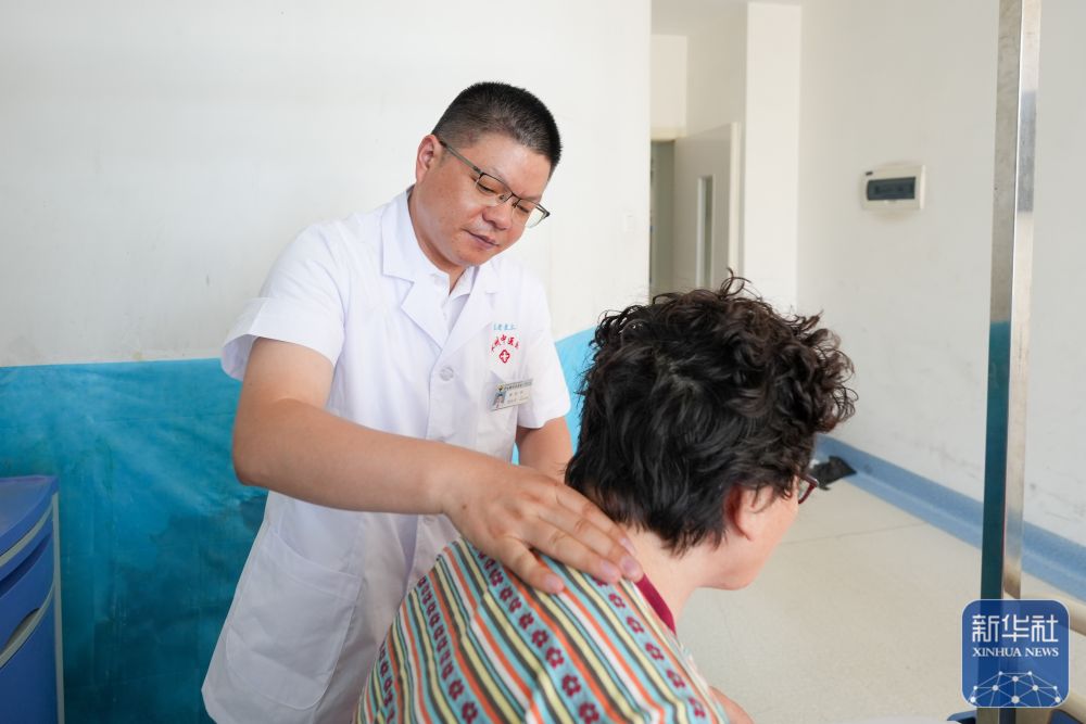在新疆伊犁哈萨克自治州中医医院,江苏援疆医生张仕兵(左)为患者检查身体(2025年7月6日摄)。新华社记者 徐宏岩 摄
