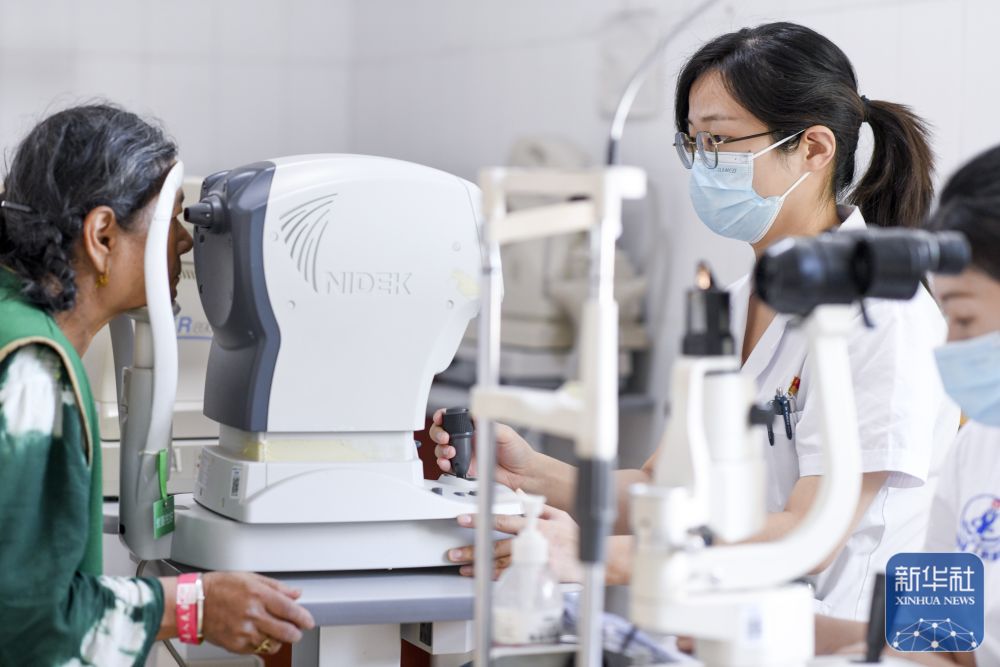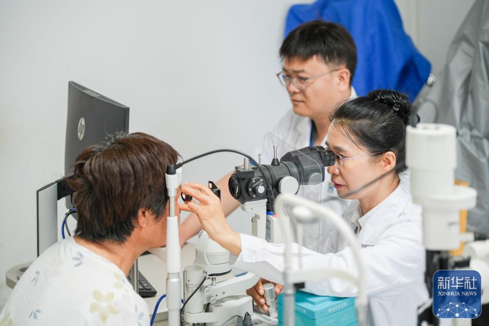 在新疆伊犁哈萨克自治州中医医院,江苏援疆医生林琳(右)与本院眼科主任王庆一同为患者进行眼部检查(2025年7月6日摄)。新华社记者 徐宏岩 摄