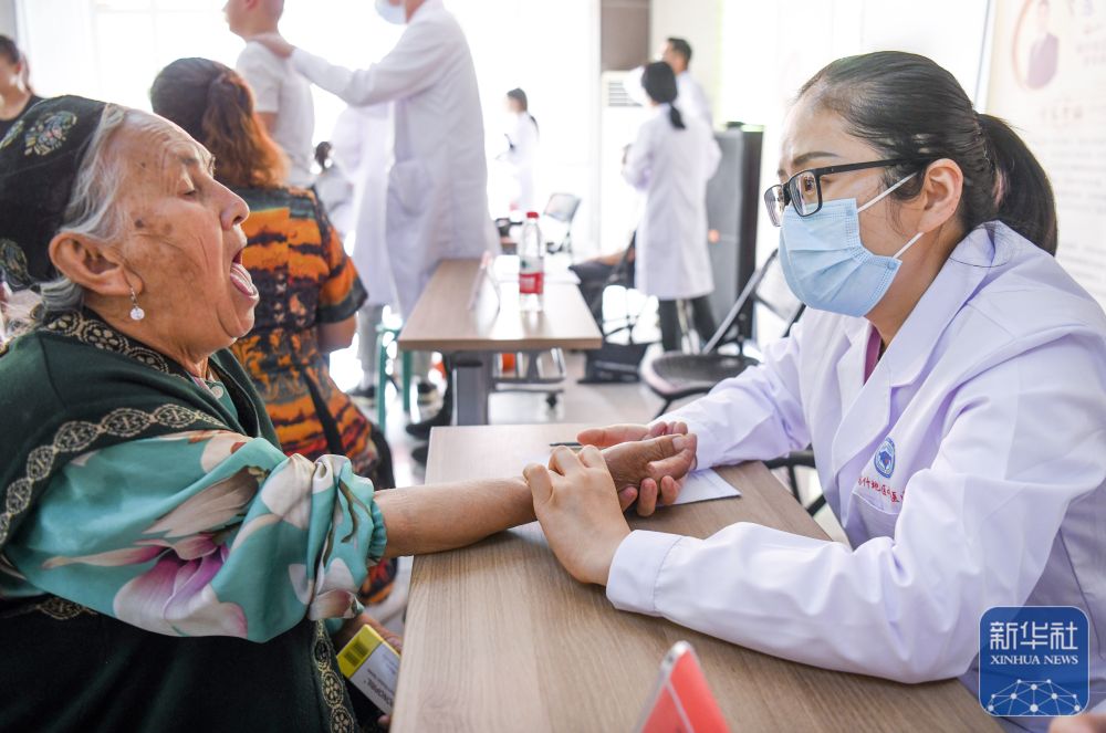 在新疆喀什市夏马勒巴格镇团结小区,来自山东中医药大学第二附属医院的援疆医生李荣华(右)为居民义诊(2023年9月16日摄)。新华社记者 王菲 摄
