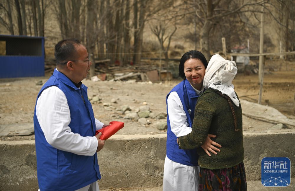 新疆塔什库尔干塔吉克自治县库科西鲁格乡的一名年长村民(右)拥抱上门送诊的深圳援疆医生(2025年3月24日摄)。新华社记者 胡虎虎 摄