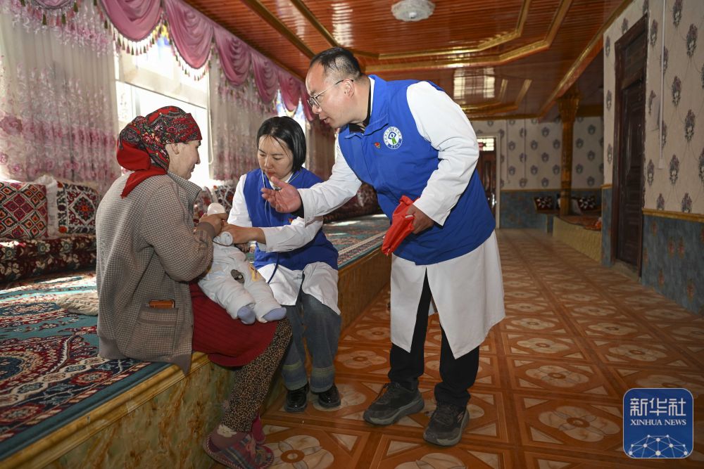 在新疆塔什库尔干塔吉克自治县库科西鲁格乡瓦窑本村,深圳援疆新生儿科医生潘千(中)与同事许林森(右)在村民家为新生儿检查身体,并叮嘱养护注意事项(2025年3月24日摄)。新华社记者 胡虎虎 摄
