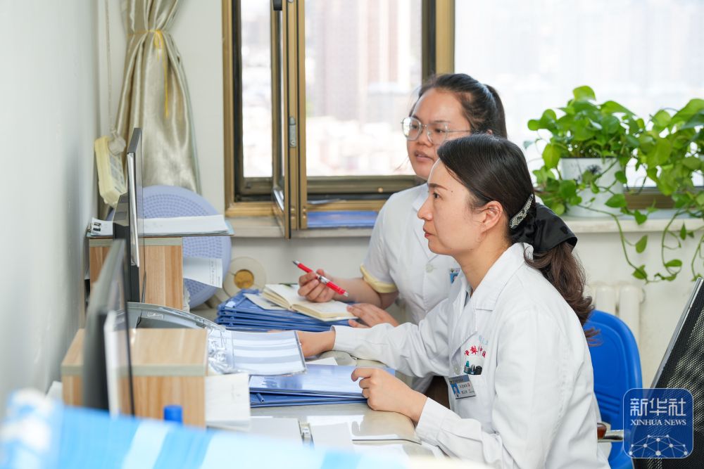 在新疆伊犁哈萨克自治州中医医院,江苏援疆医生郭云柯(前)与本地医生一同探讨病例(2025年7月6日摄)。新华社记者 徐宏岩 摄