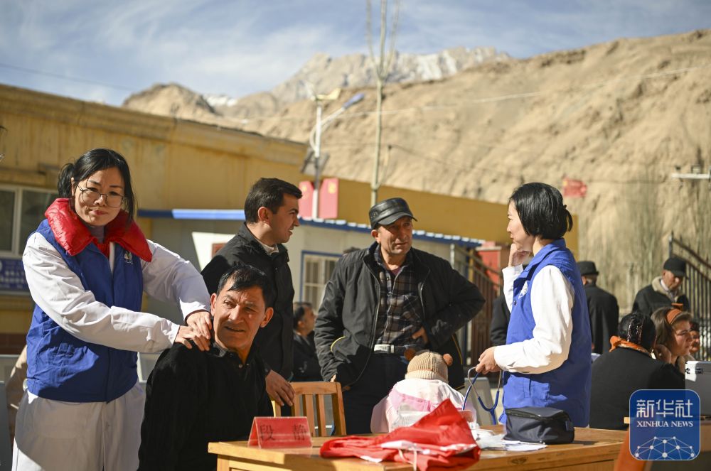 在新疆塔什库尔干塔吉克自治县库科西鲁格乡卫生院,深圳援疆重症医学科医生杨正月(右)和乡卫生院医生一起为村民检查身体(2025年3月24日摄)。新华社记者 胡虎虎 摄