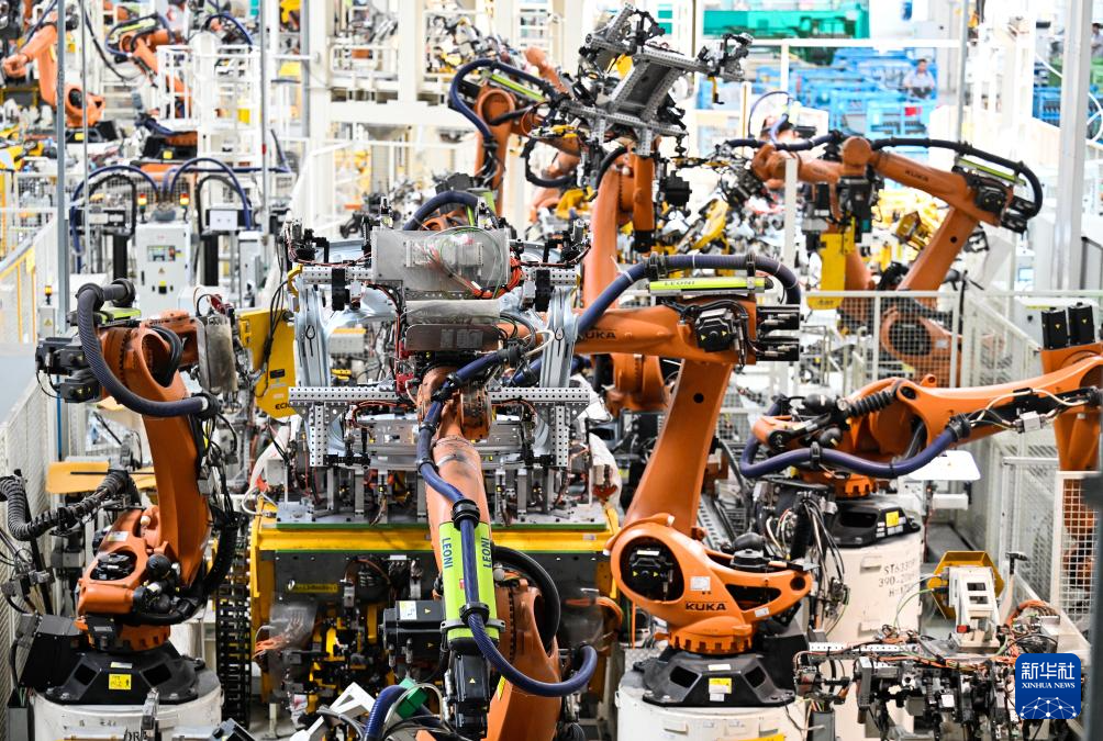 7月7日,机械臂等自动化生产设备在天津经济技术开发区一汽-大众华北基地焊装车间作业。新华社记者 赵子硕 摄