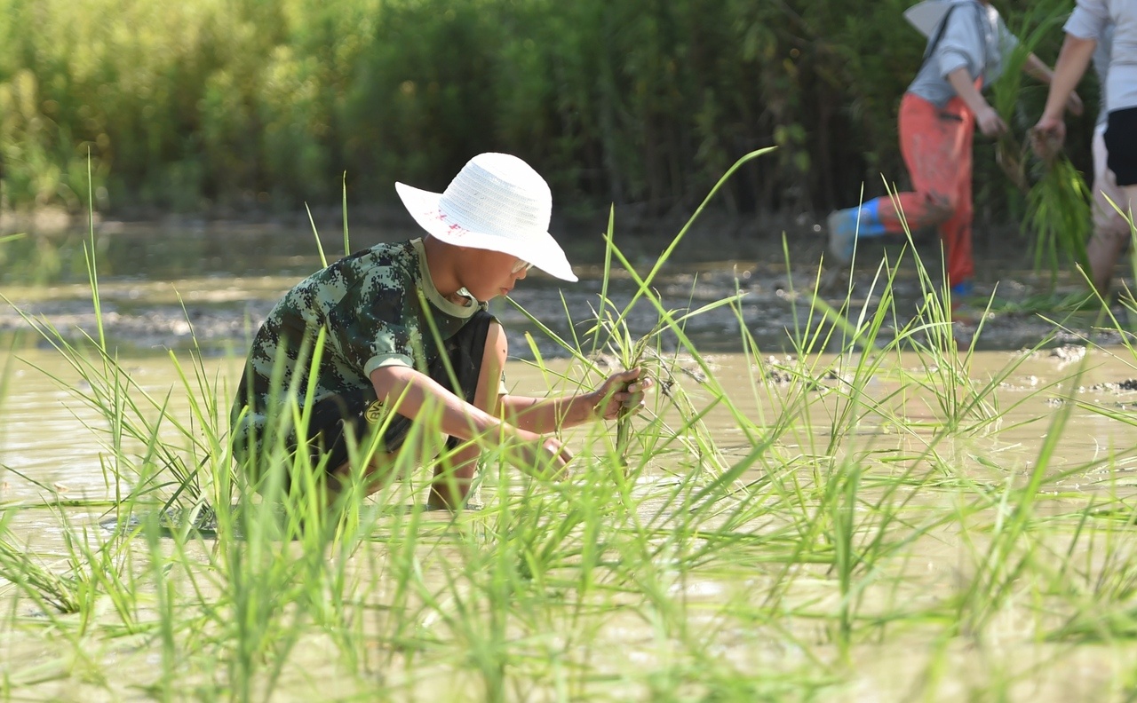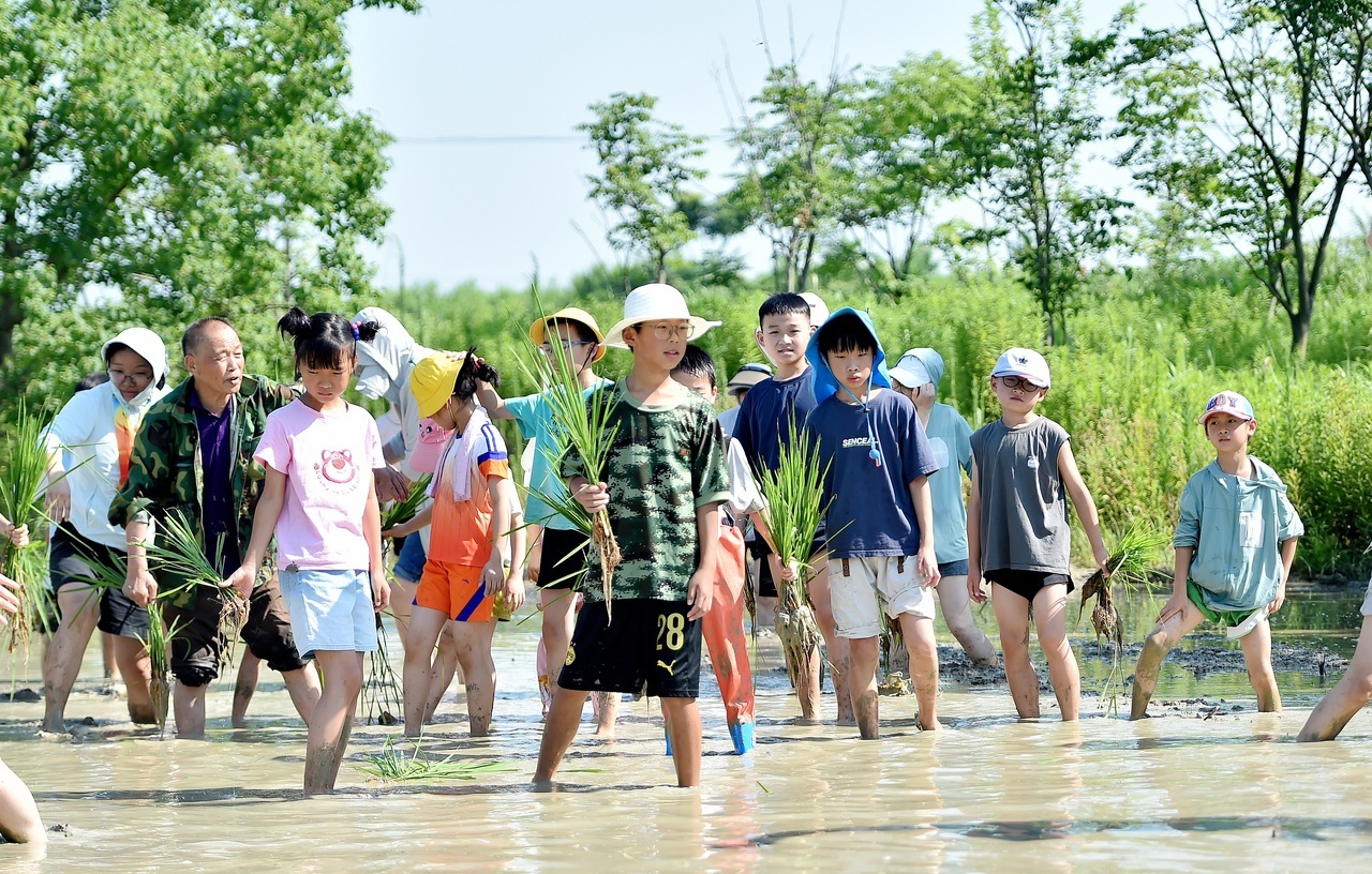 7月6日,在安徽省合肥市长丰县岗集镇一生态农业园,学生在稻田里抛秧。