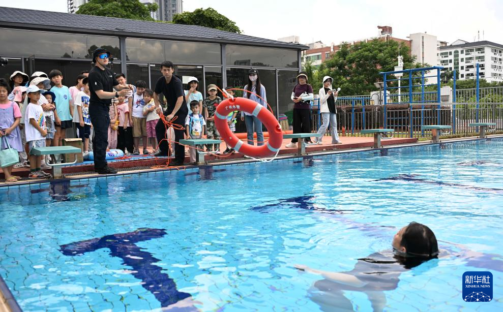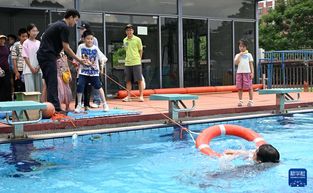 7月8日,水警协助小朋友体验岸边救援。新华社记者 邓华 摄