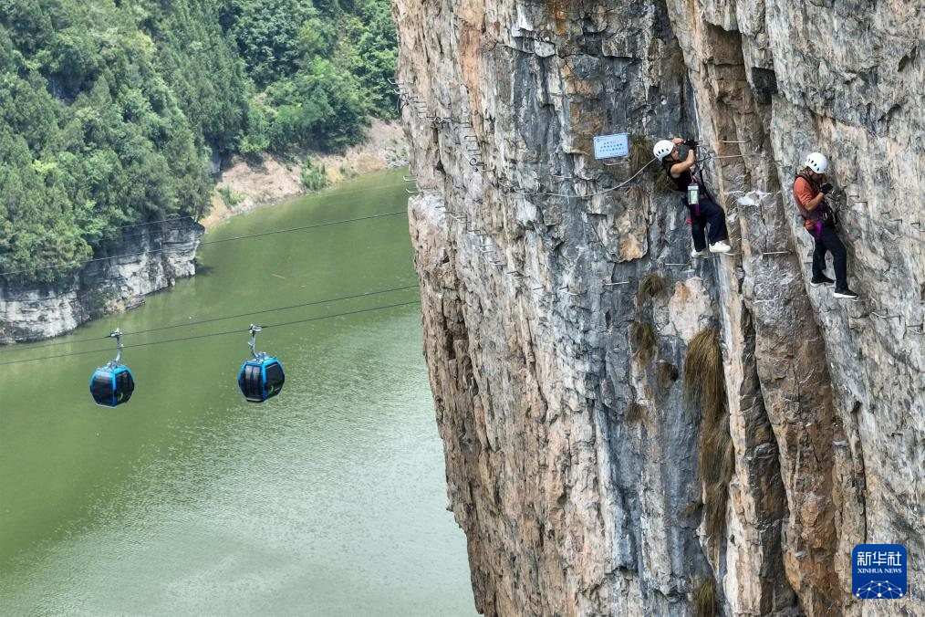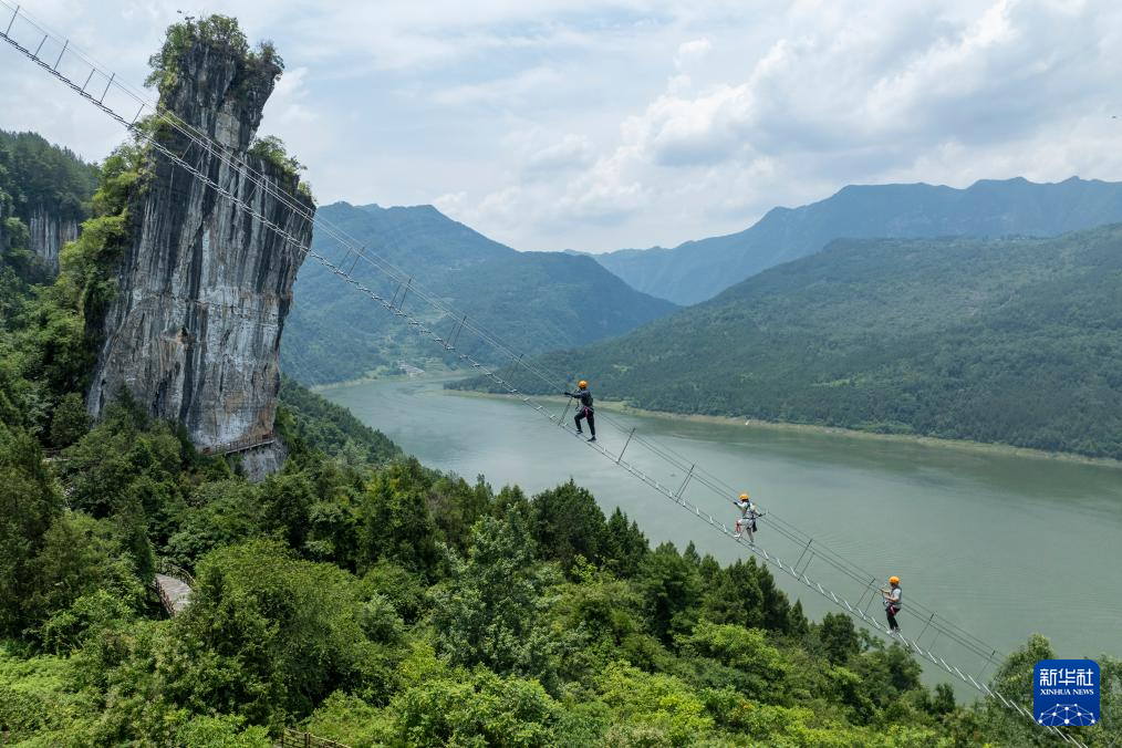 7月8日,在湖北省恩施市新塘乡红花峰林景区,游客在体验“天梯”项目。新华社记者 伍志尊 摄