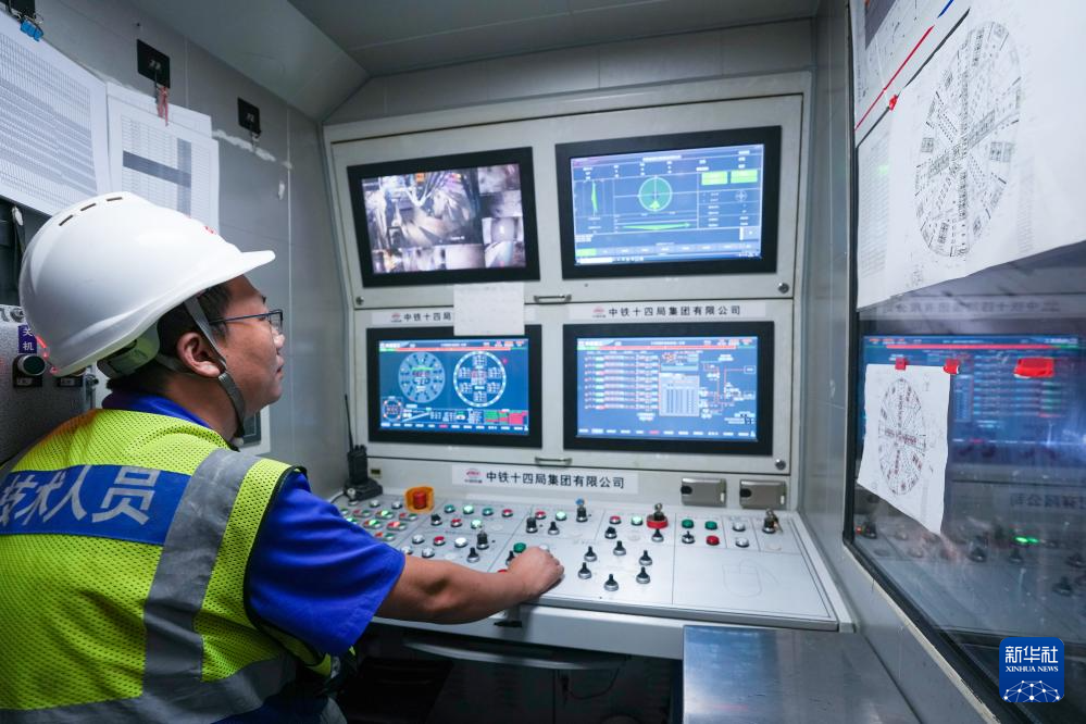 7月9日,中铁十四局的施工人员在施工现场查看盾构机作业情况。新华社记者 李博 摄