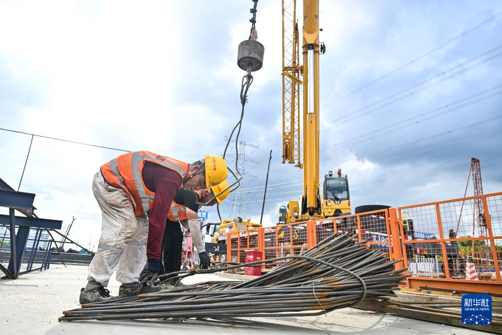7月9日,中铁十四局工人在吊运预埋钢筋。新华社记者 季春鹏 摄