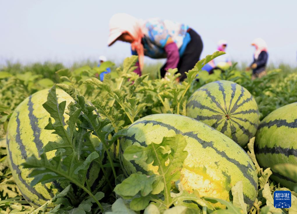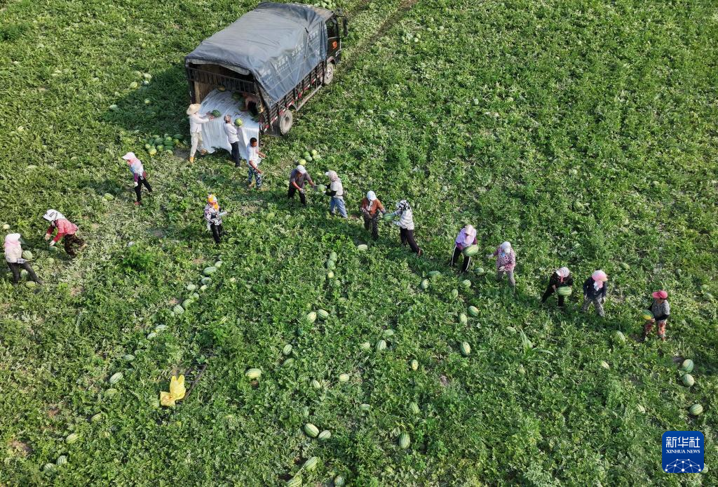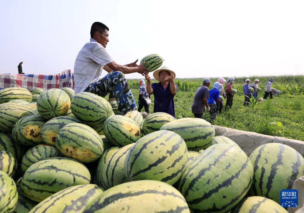 7月9日,河北省唐山市丰南区东田庄镇大吴庄户村的农民在田间收获西瓜。新华社记者 杨世尧 摄