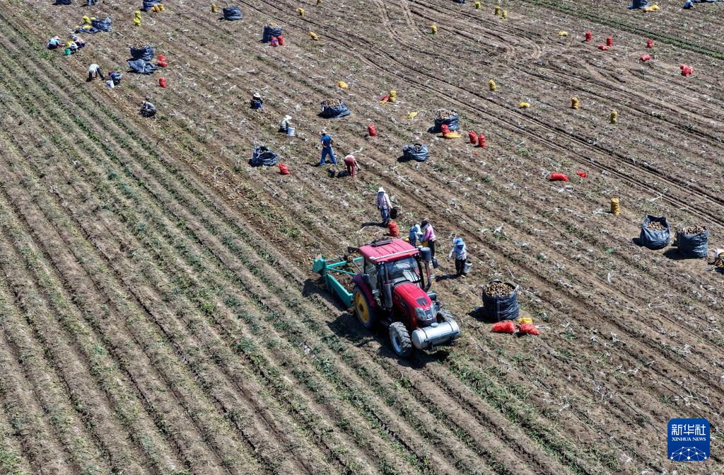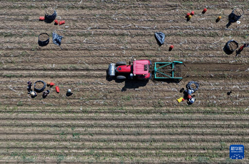 7月9日,河北省唐山市丰南区大新庄镇大岭子村的农民在田间收获马铃薯(无人机照片)。新华社记者 杨世尧 摄