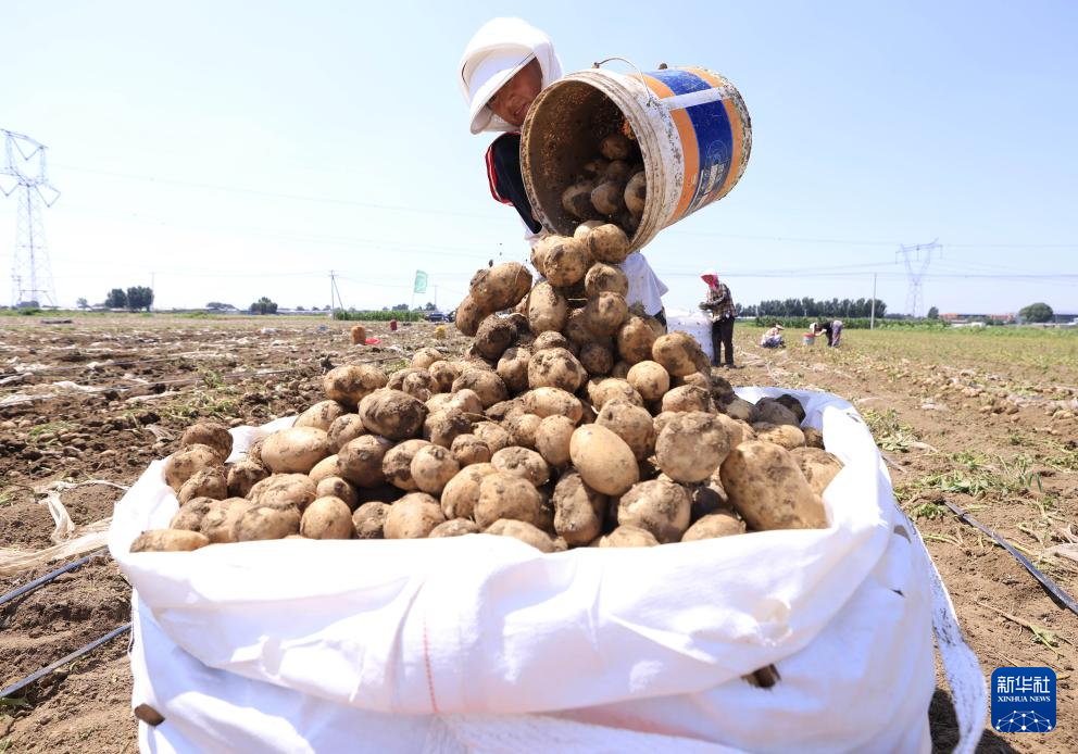 7月9日,河北省唐山市丰南区大新庄镇大岭子村的农民在田间收获马铃薯。新华社记者 杨世尧 摄