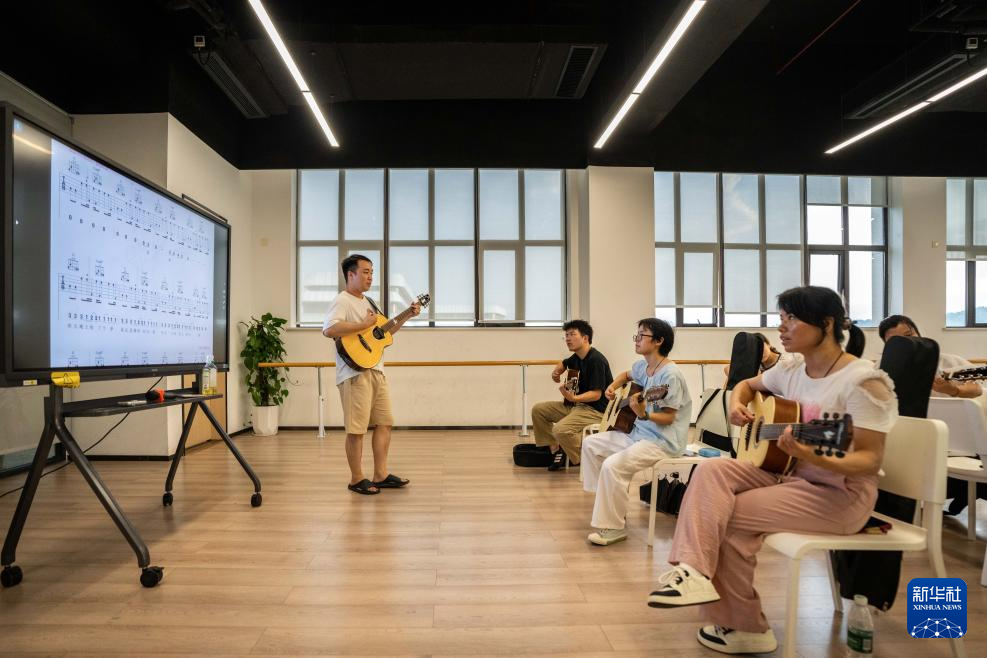7月9日,在湖南湘江新区文化馆,老师(左一)在传授吉他演奏技巧。新华社记者 陈思汗 摄