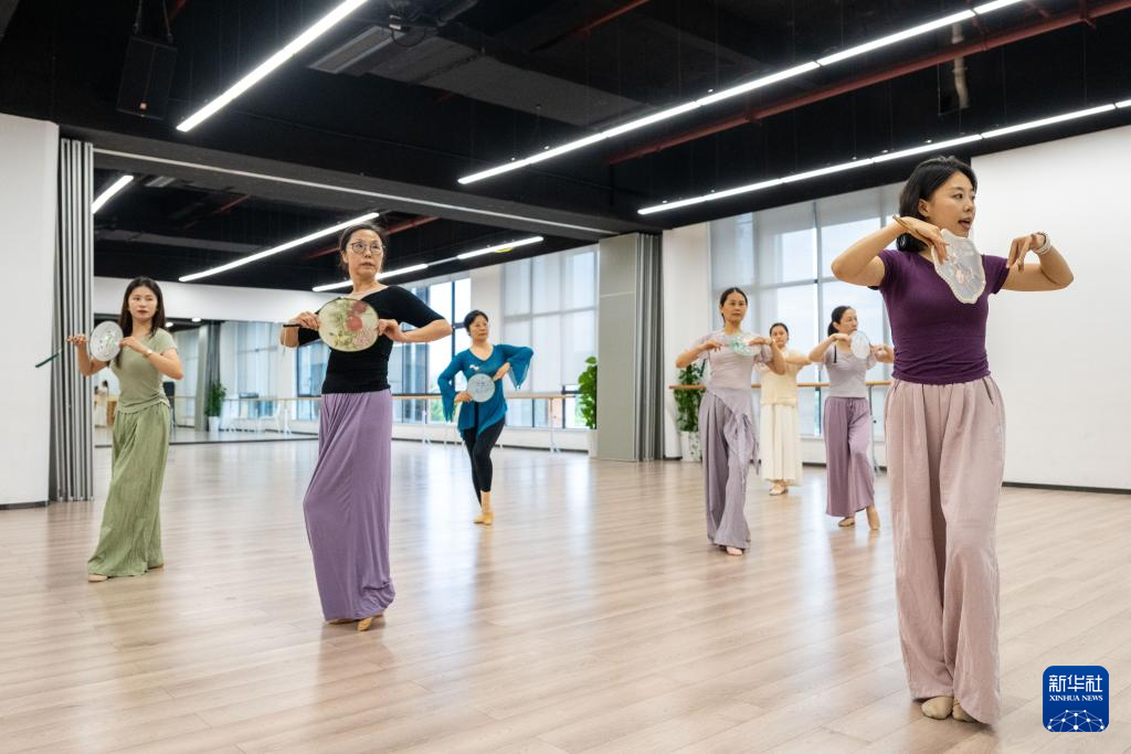 7月9日,在湖南湘江新区文化馆,老师(右一)带领学员练习古典舞。新华社记者 陈思汗 摄