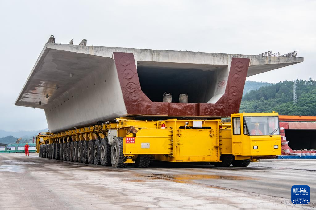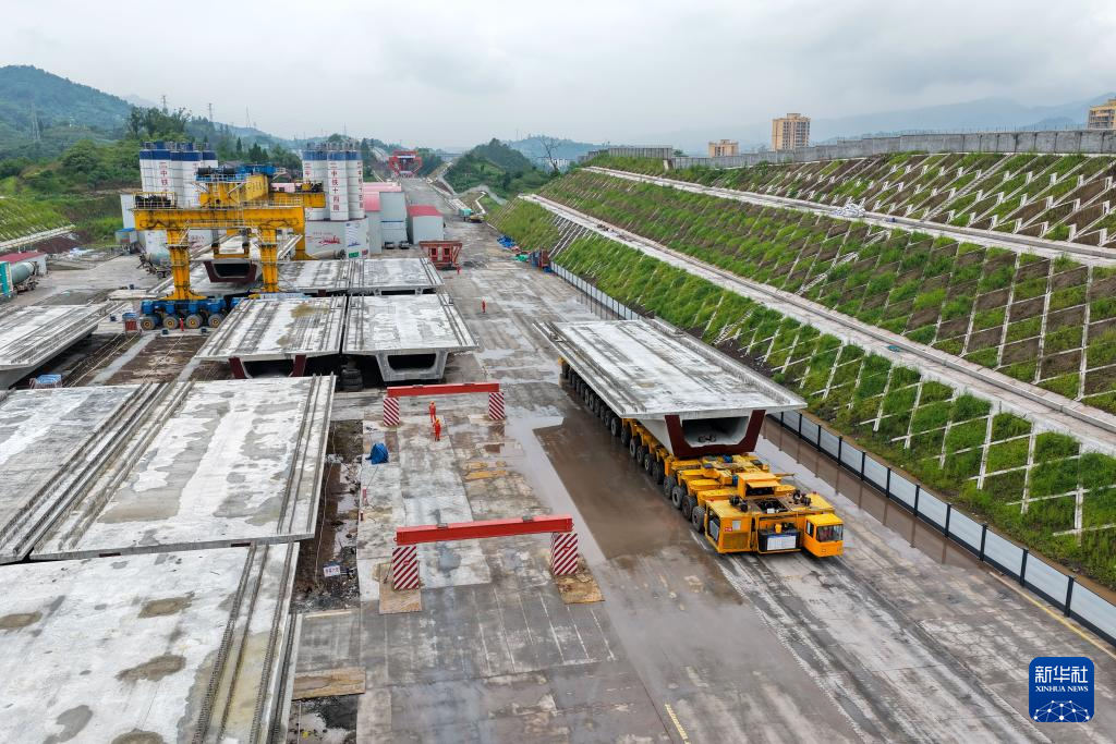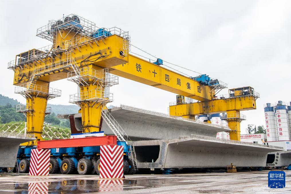 7月10日,在西渝高铁陈家沟特大桥附近的制梁场,运梁机在进行箱梁转运作业。新华社记者 唐奕 摄