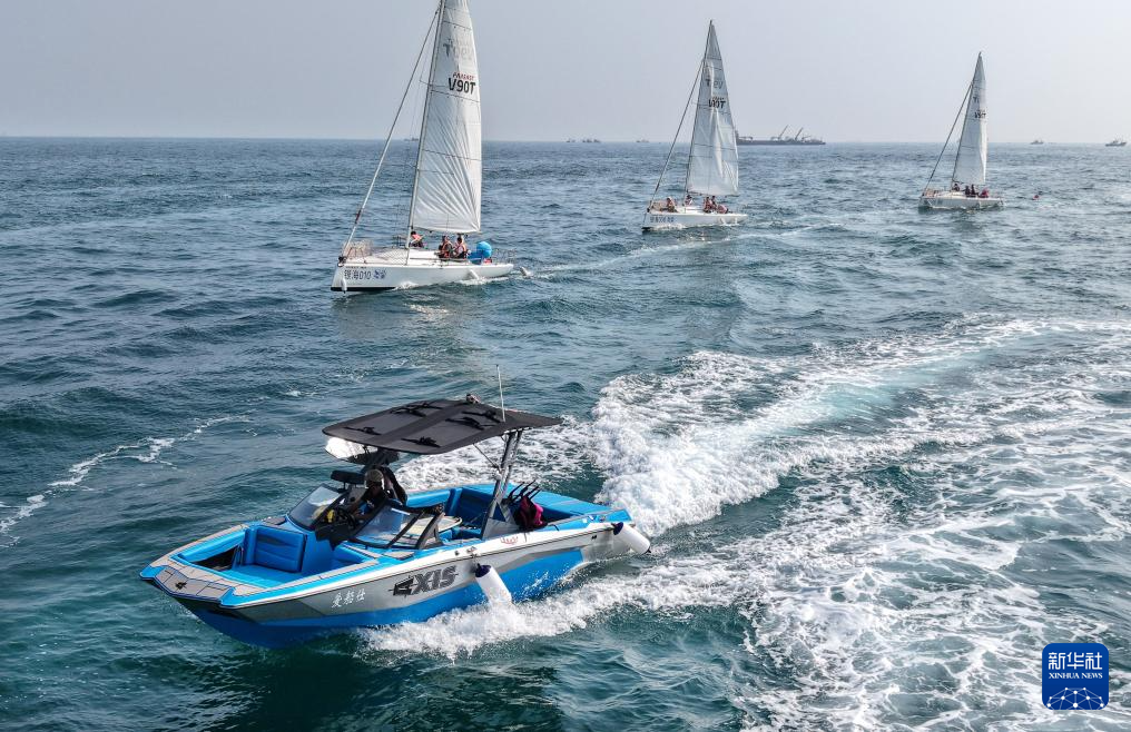青岛老龙湾海域,摩托艇参加海上巡游活动(7月10日摄,无人机照片)。新华社记者 李紫恒 摄