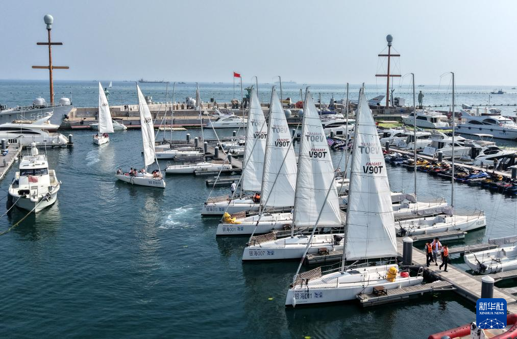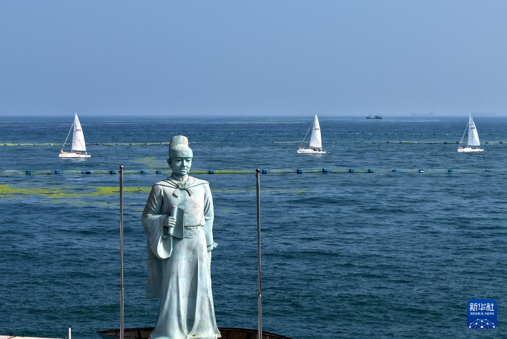 青岛银海大世界港池外,参加海上巡游的帆船从郑和雕像旁驶过(7月10日摄,无人机照片)。新华社记者 李紫恒 摄